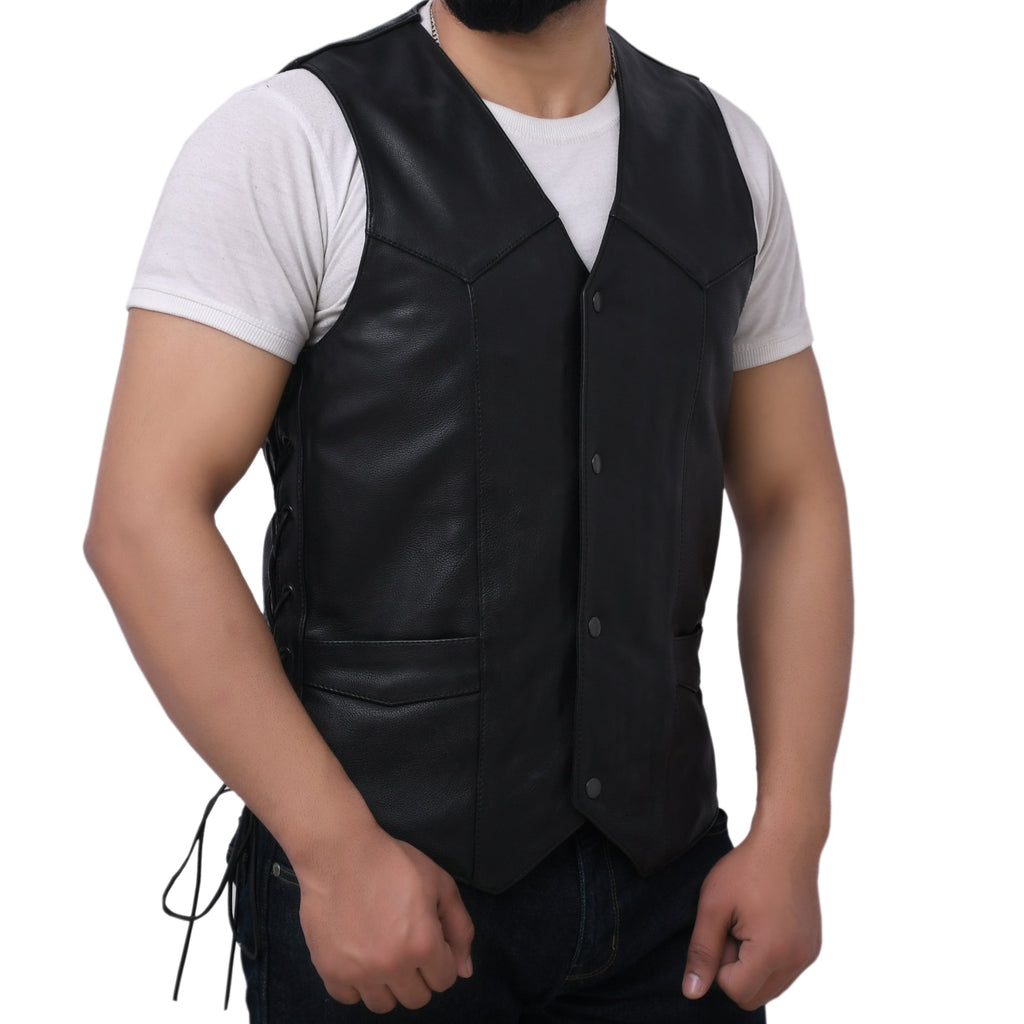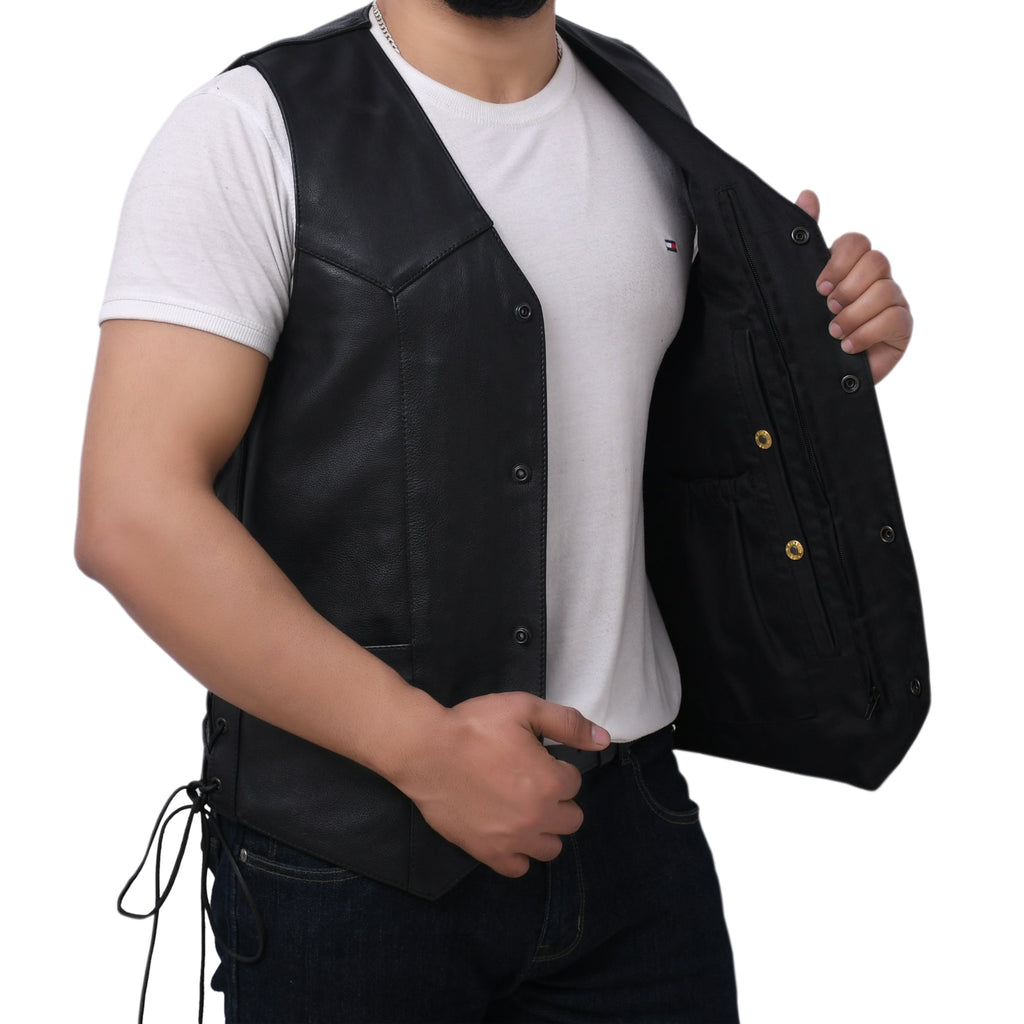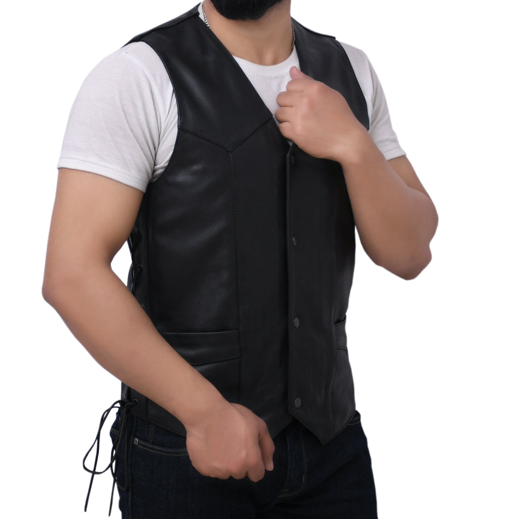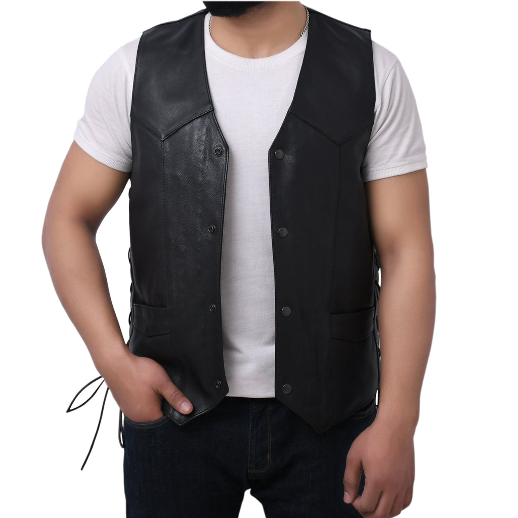 This leather outerwear boasts a western style with V-neck. It includes a side licing and various pockets. It‚ is also less expensive than a comparable down vest and noticeably lower-profile - affordable option for all.