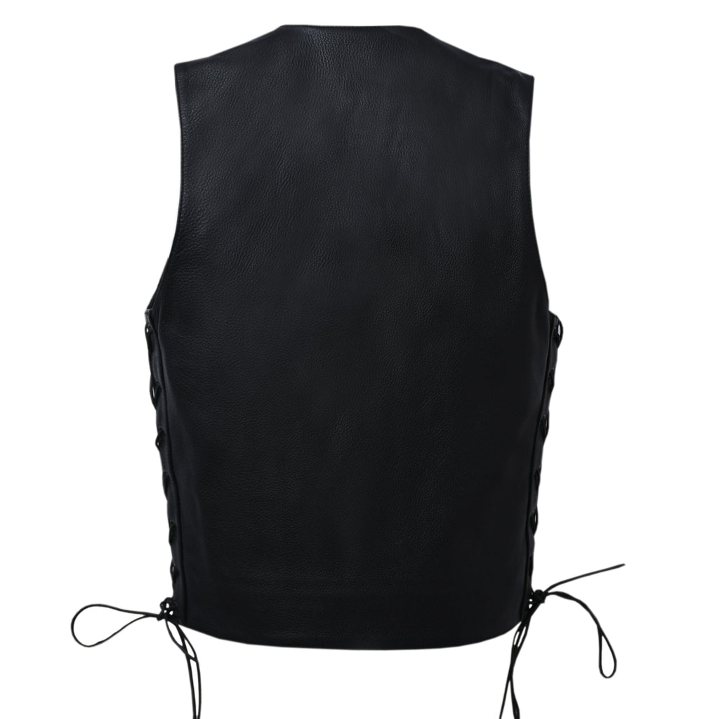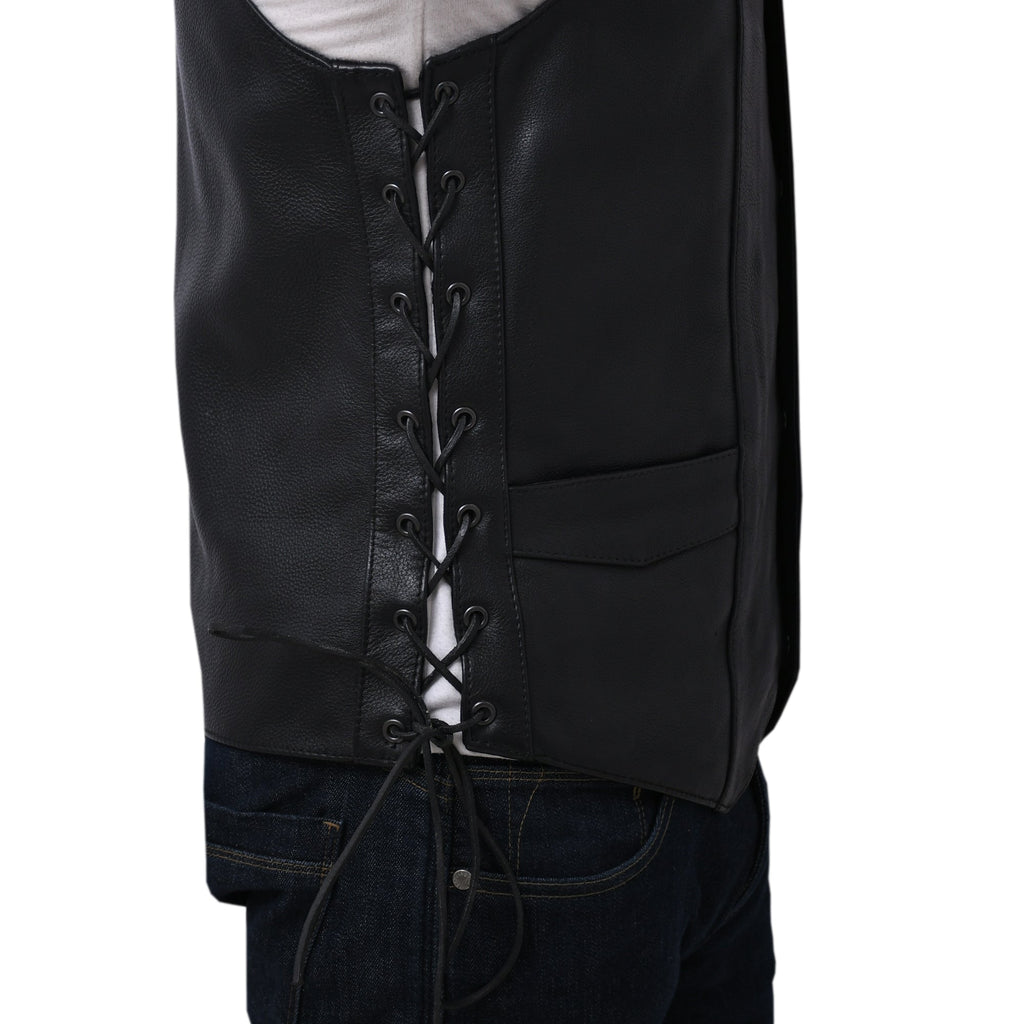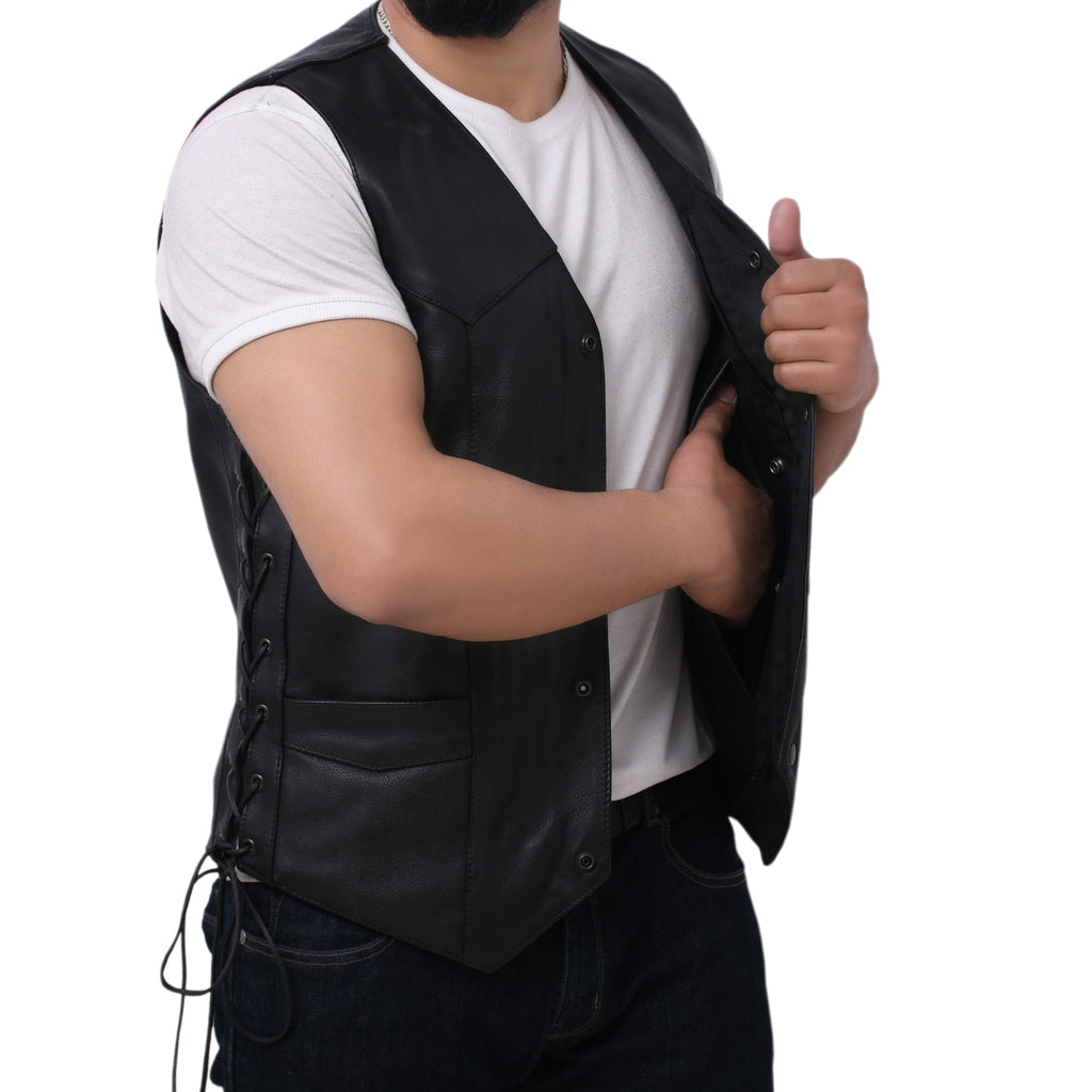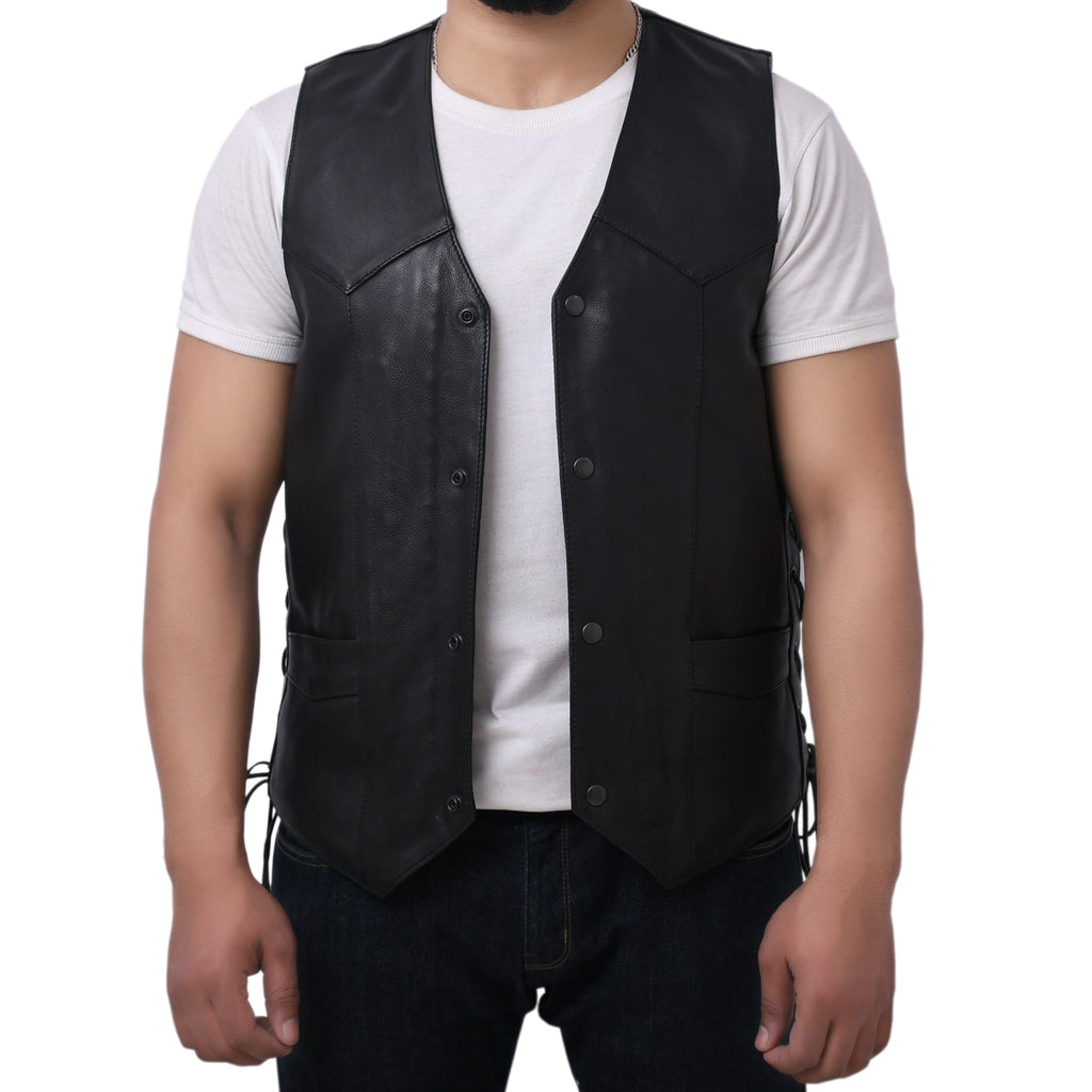 This leather outerwear boasts a western style with V-neck. It includes a side licing and various pockets. It‚ is also less expensive than a comparable down vest and noticeably lower-profile - affordable option for all.